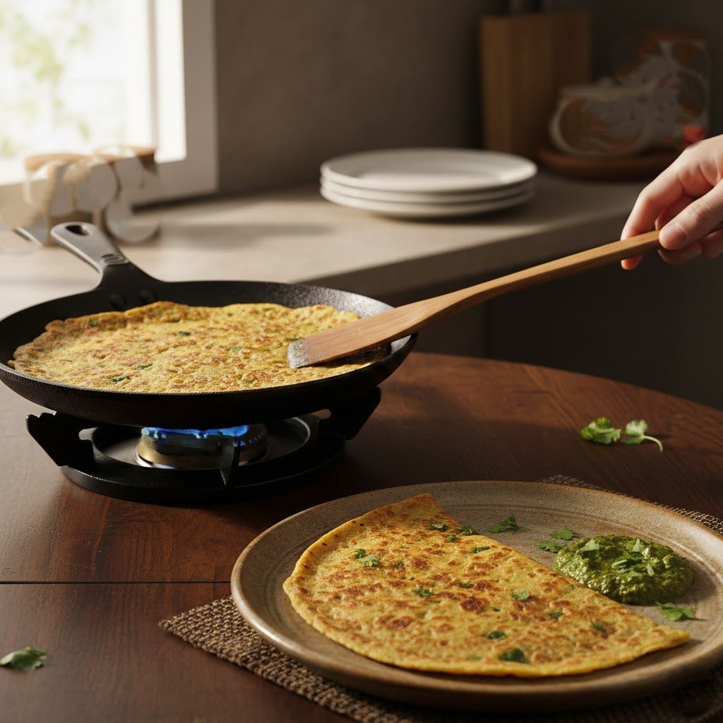 Ground moong dal batter is cooked like a thin hotcake on a hot visage. These chillas are rich in protein and easy to digest. Serve with yogurt or mint chutney for a wholesome mess.