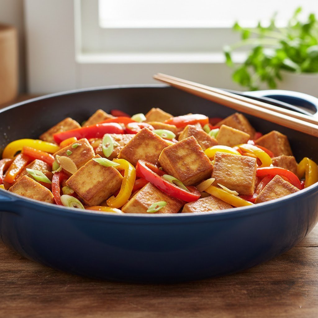 Establishment tofu cells arepan-seared until crisp, also tossed with various bell peppers and soy sauce. Tofu absorbs flavors well and offers a solid factory- grounded protein option. This dish is presto, light, and satisfying.