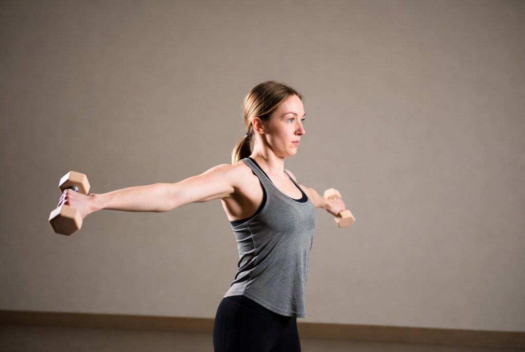 You should use light weights while you lean forward into the position that you used for the rows. The arms should be extended to the side of the body in a way that creates a wingspan appearance. The exercise works the small muscles located at the back of your shoulders which help to maintain proper posture by preventing slouching.