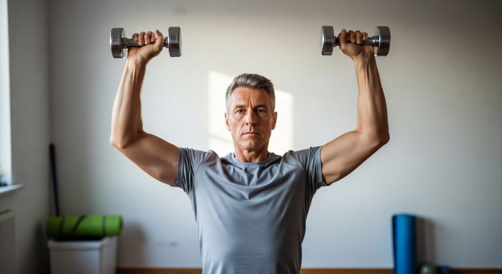 Research conducted by the Tufts University Human Nutrition Research Center reveals that shoulder strength reduces by about 15 percent every decade beyond 50 years old. This decrease is fought back with significant progress in regular overhead pressing with light to medium dumbbells. Participants in a 12 week resistance training program had full shoulder range and testified they had much better posture and neck tension had been greatly alleviated during the day.