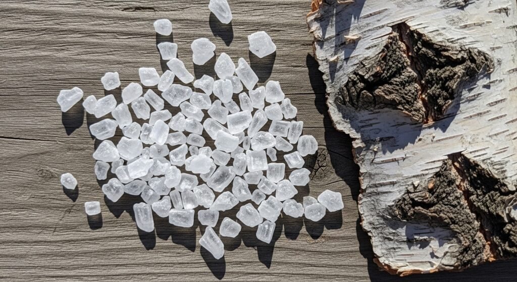 The sugar-like substance xylitol which originates in birch trees contains 40 percent fewer calories than traditional sugar. The dental product prevents bacteria from growing which would otherwise create cavities. The substance causes severe harm to dogs therefore people must handle the product with extreme care.