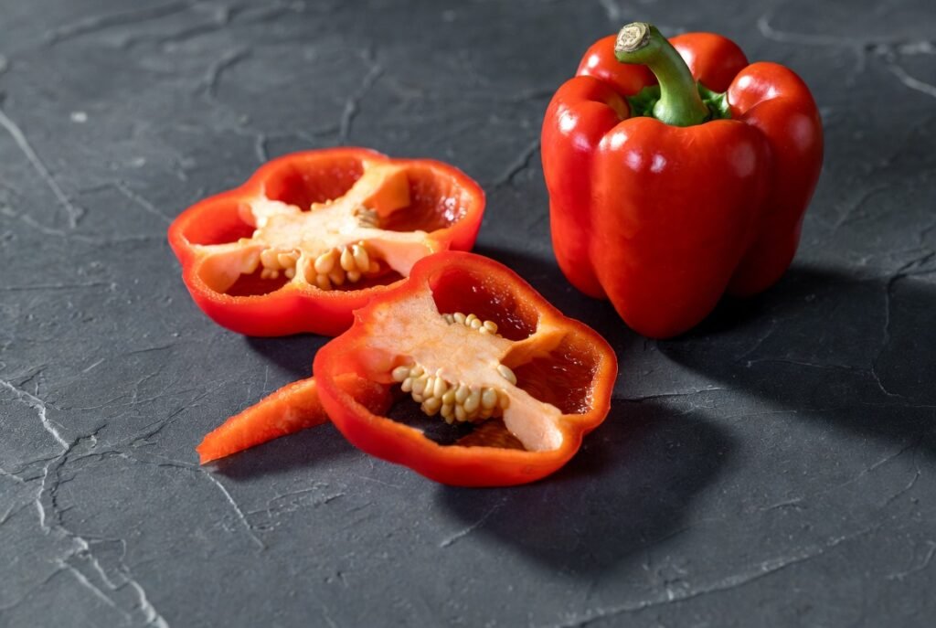 Red bell peppers are rich in carotene and vitamin c. These antioxidants enhance health, immunity, improve the skin state and shelter the body against environmental strains.