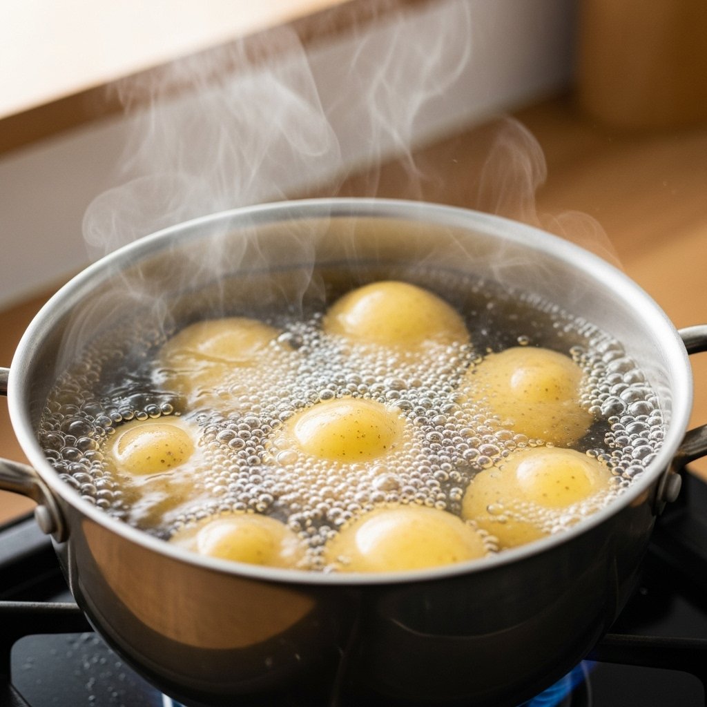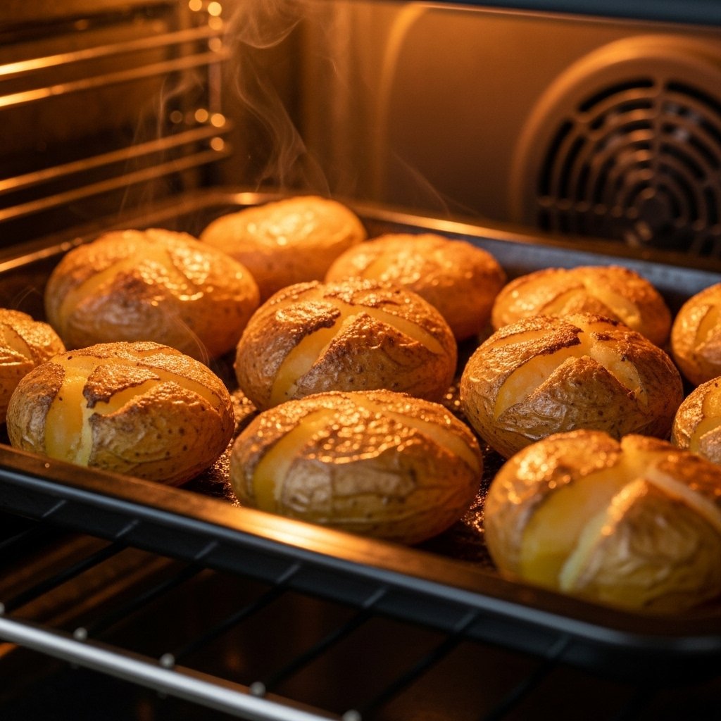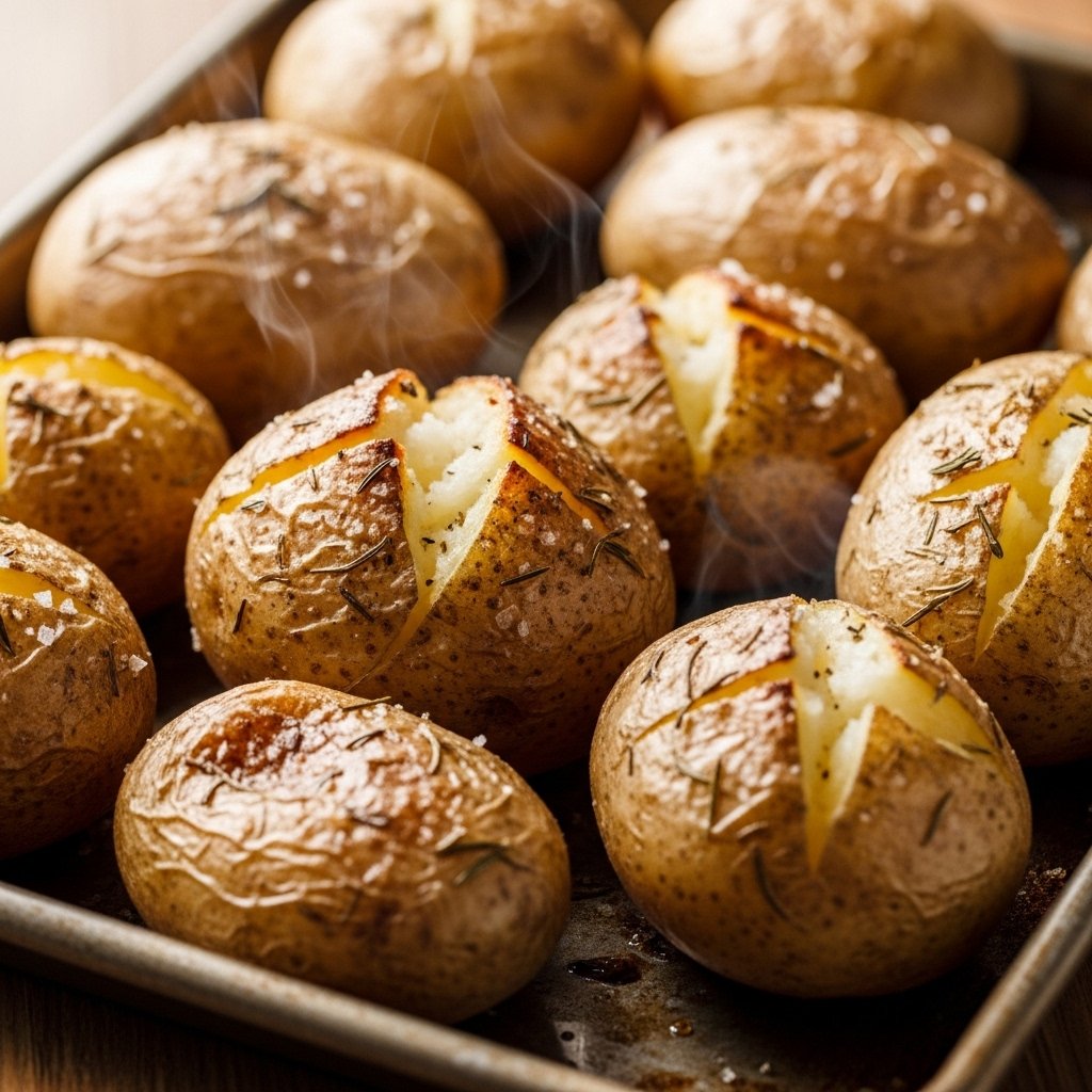 The cooking process starts with whole unpeeled potatoes being boiled in salted water until they reach a stage where they can be eaten using a fork. The process creates soft starches which enable the outer layer to become crispy during baking while the interior maintains its fluffy state instead of turning hard.