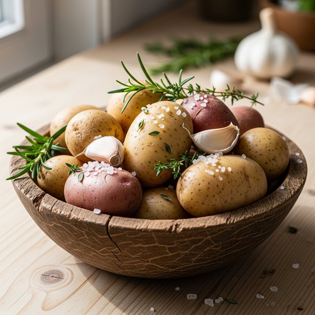 The recipe requires small thin-skinned potatoes which include Baby Yukon Golds and Red Bliss. The small size of the item produces an increased surface area which results in more delicious crispy edges.