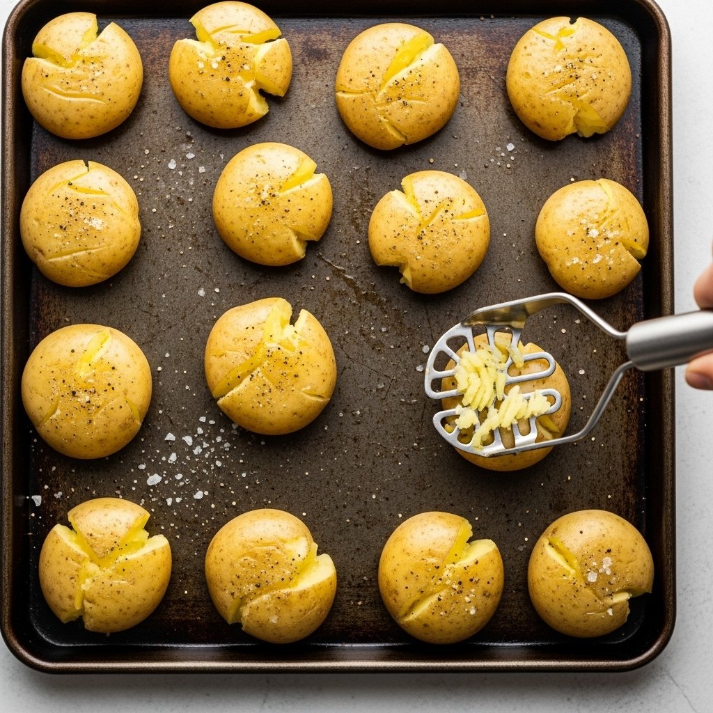 The next step requires you to move the drained potatoes onto the baking sheet after you finish boiling them. The glass base or potato masher base should be used to press each potato until it reaches a thickness of half an inch. The process creates multiple openings in the skin which enable oil and spices to adhere to the potato surface.