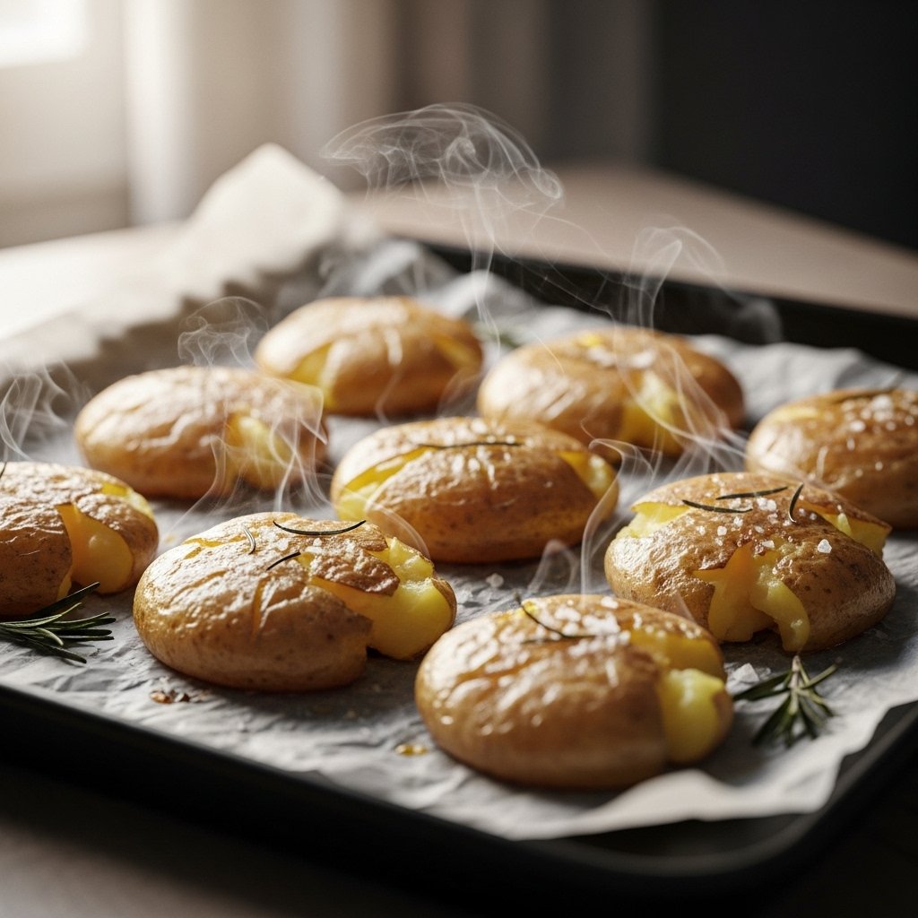 The two-minute resting period for smashed potatoes begins immediately after they finish their smashing process. The process allows steam to leave the inside. The potatoes must wait until all their moisture has vanished before they can accept oil because their remaining wetness will produce steam in the oven instead of creating a crunchy finish. The processing of potato products from dry potatoes results in the production of a crunchy texture.