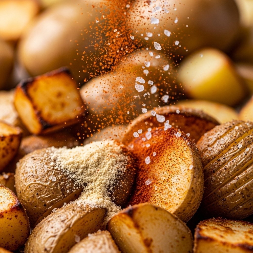 The addition of garlic powder, smoked paprika and sea salt should be used to enhance the taste of your smashed potatoes. Garlic powder functions as the better option because fresh garlic burns at high roasting temperatures which creates a bitter flavor.