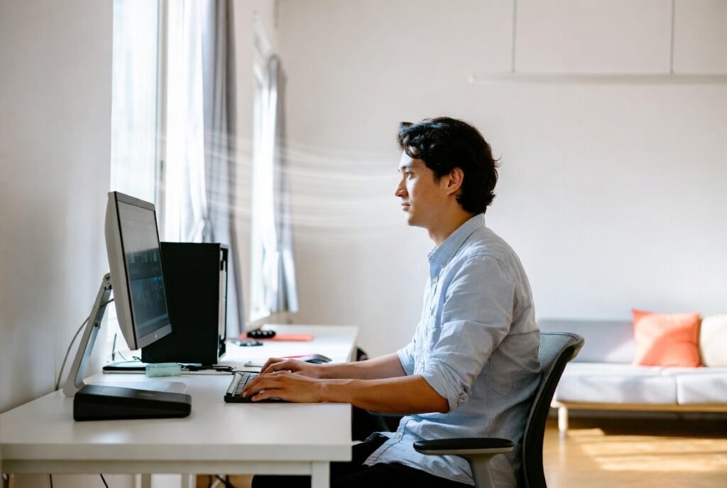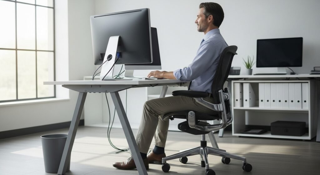 Poor posture leads to breathing difficulties and muscle tension which results in hidden energy loss. Your body can use energy more efficiently when you set your screen at eye level and your chair supports your spine.