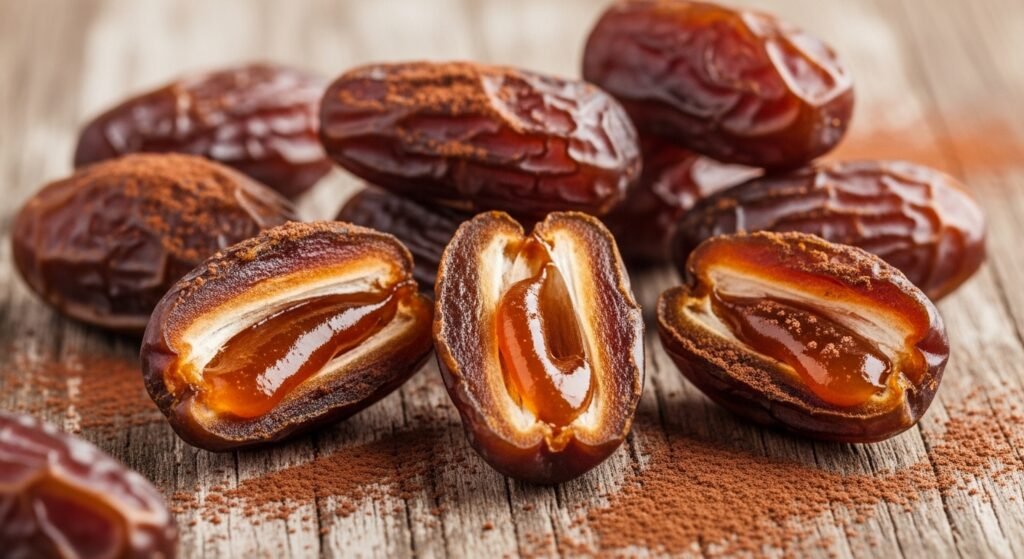 Whole dates deliver a high fiber content which functions as a “buffer” to protect their sugar content. Dates enable people to experience energy increases which happen at a slower rate while they receive magnesium and copper in healthy amounts.