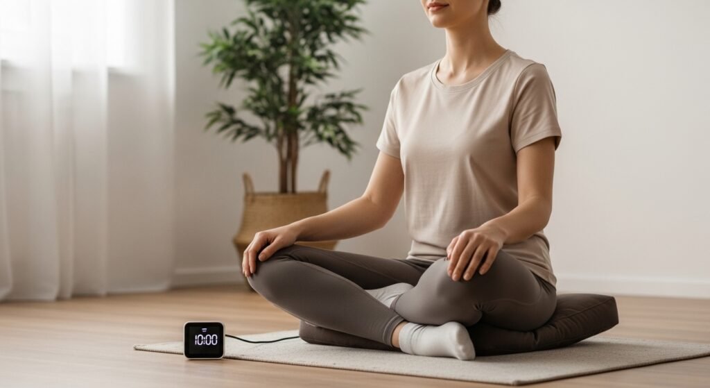 When the timer is switched off, meditation is not finished. The examples of the situations that could be more mindful in everyday life include eating, walking, or listening, and the participant should be trained to stay calm with no focus when he/she is not practicing the exercises.