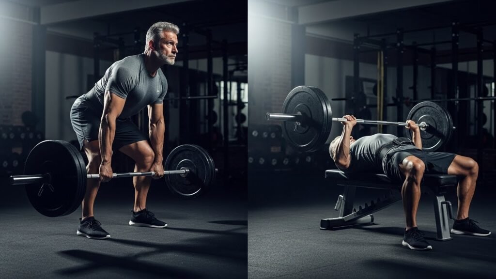 Monday: Squats 3×10, bench 3×8, rows 3×10, planks. Tuesday: 40 min easy bike or rowing, 20 min yoga. Wednesday: Rest or walk. Thursday: Overhead press, pull-ups, dips. Friday: Deadlifts, lunges, carries. Saturday: Fun stuff or fast cardio. Sunday: Rest.