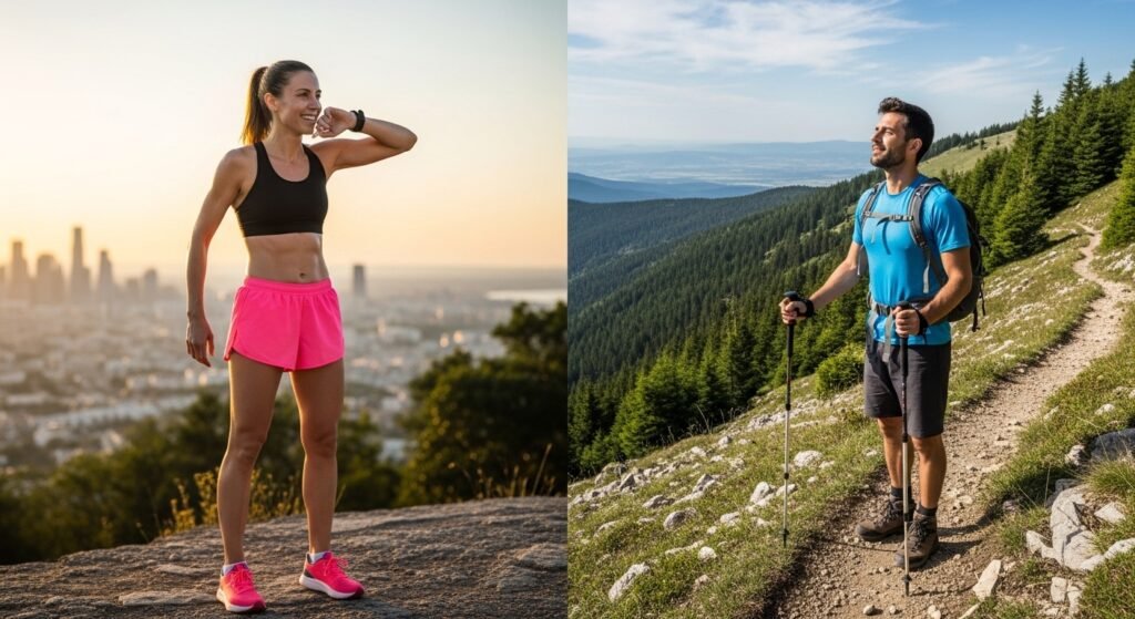 Most times, running wins for calorie burn in shorter sessions. Yet hiking up a slanting path might match it – particularly if the slope is sharp and you keep moving steadily.