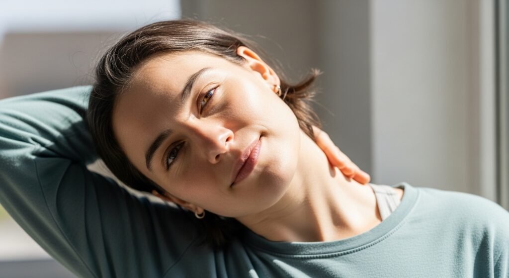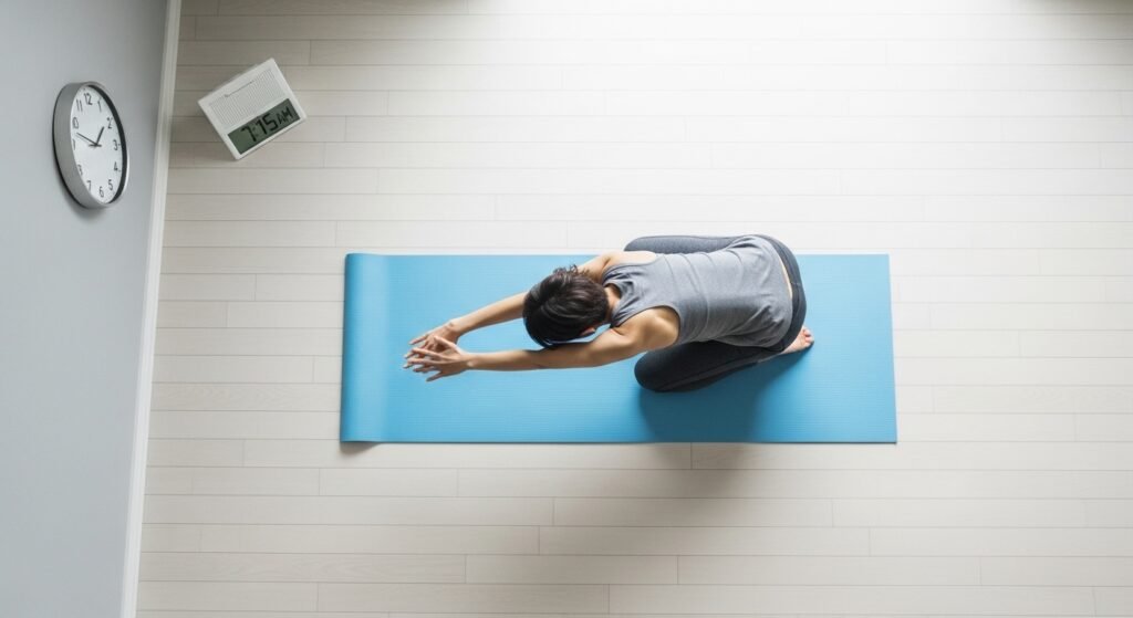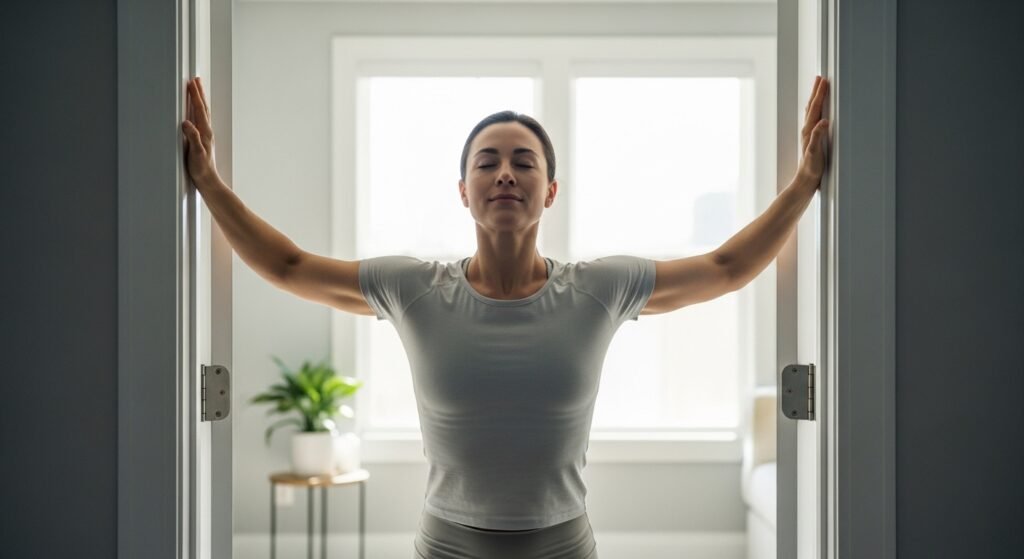 Forward desk posture flattens your mid-back to the degree that it is your new default position to have curved shoulders. A 60-second doorframe chest stretch instantaneously opens compressed thoracic vertebrae, restores the shoulders, and measurably enhances the breathing capacity, which is regularly limited by poor posture during your entire working day of sitting.