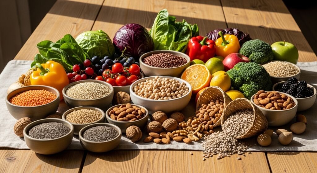 The plant foods take the centre stage of the longevity-promoting diet. Vectables, fruits, legumes, whole grains, nuts and seeds have fiber, antioxidants and phytonutrients, which provide protection to cells, and carry out immune actions forming a highly nutritional cornerstone in the long-term health.