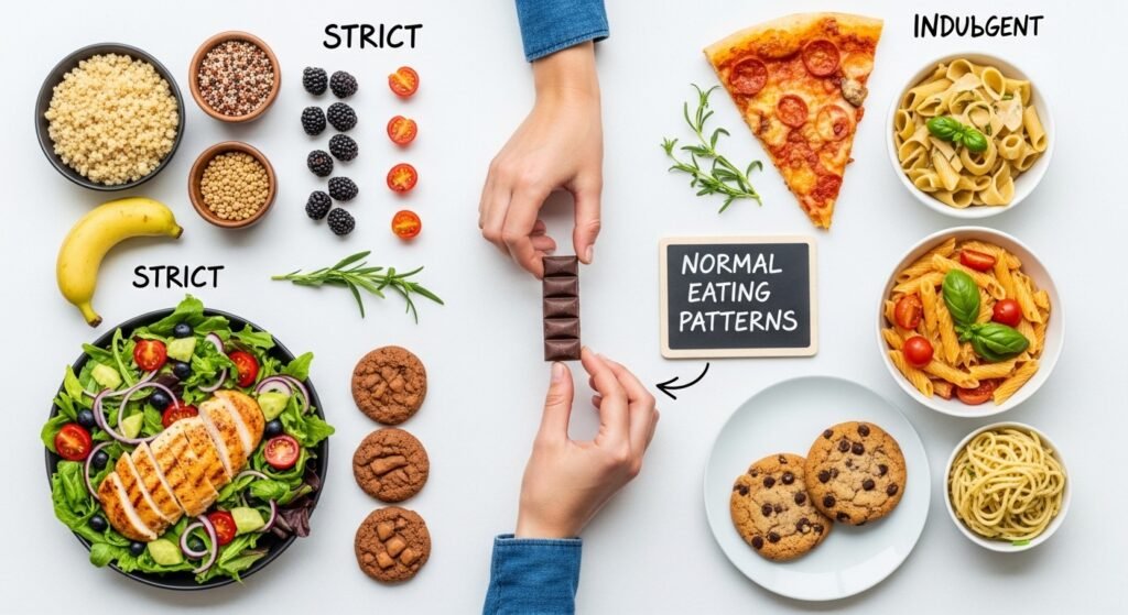 Strict food suggestions are loosely being made. Tolerance of indulgence is in a normal pattern of eating without the feeling of being denied which is likely to lead to binge eating.