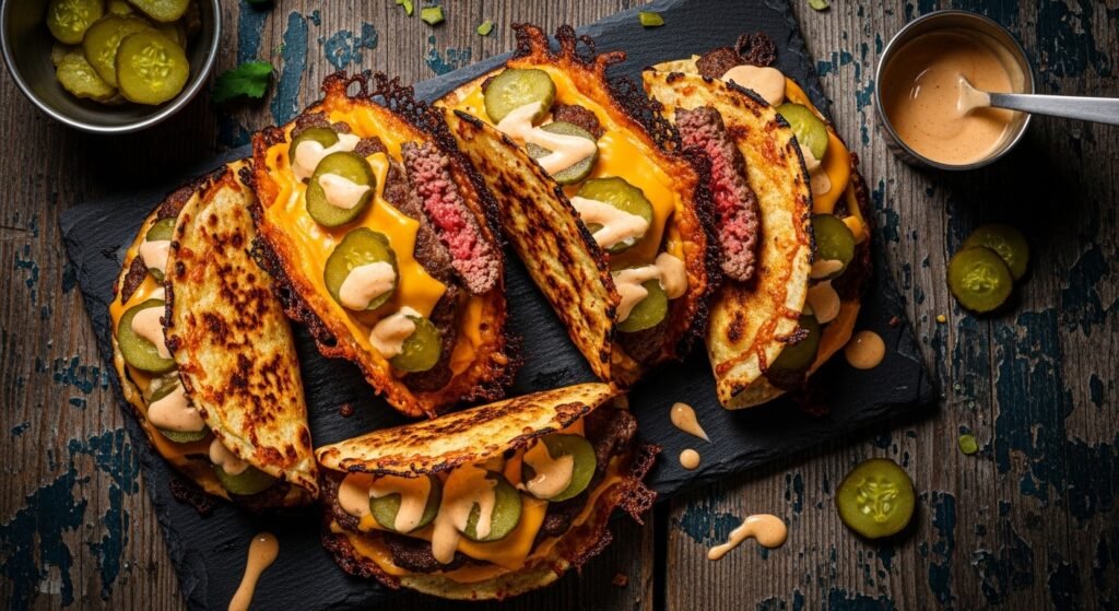The two comfort dishes in hand items are smash burger tacos. Ground beef is filled directly on the top of the tortillas and baked to a crisp before being covered with cheese, pickles and sauce. The result is hedonism but a quick preparation.