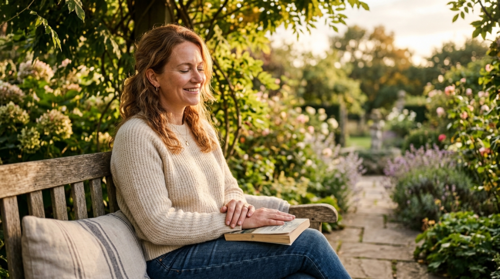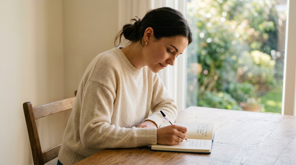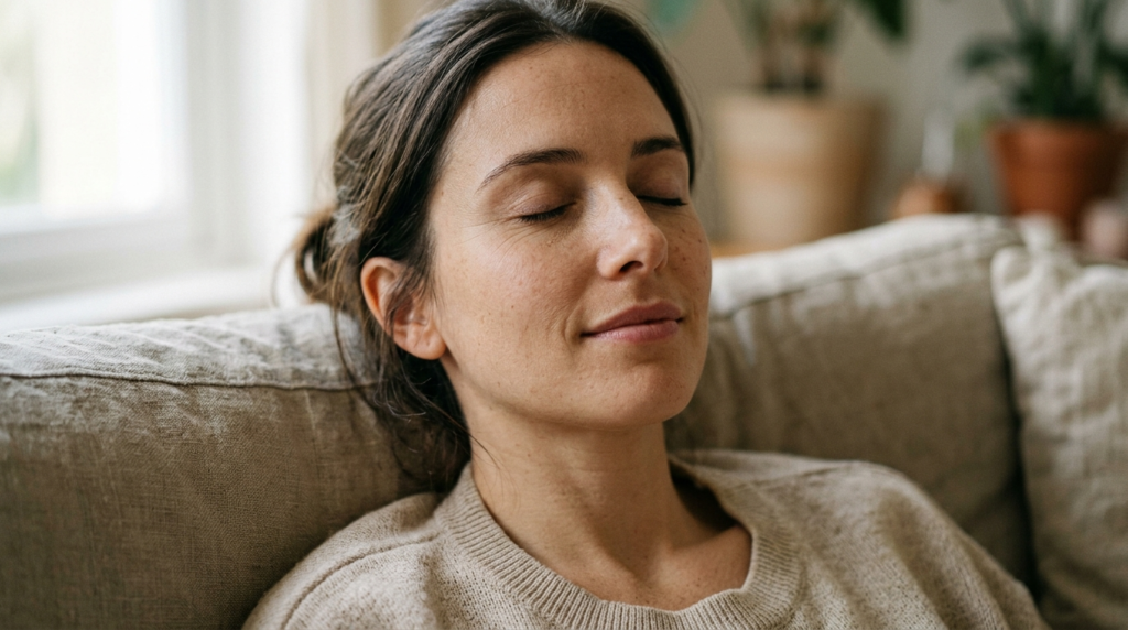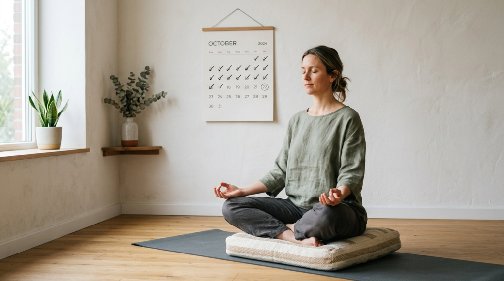 Breathe in, counting four times, hold four times, breathe out four times. It is a basic box-breathing habit that soothes the nervous system quickly and gives a wandering mind something tangible to hold on to.