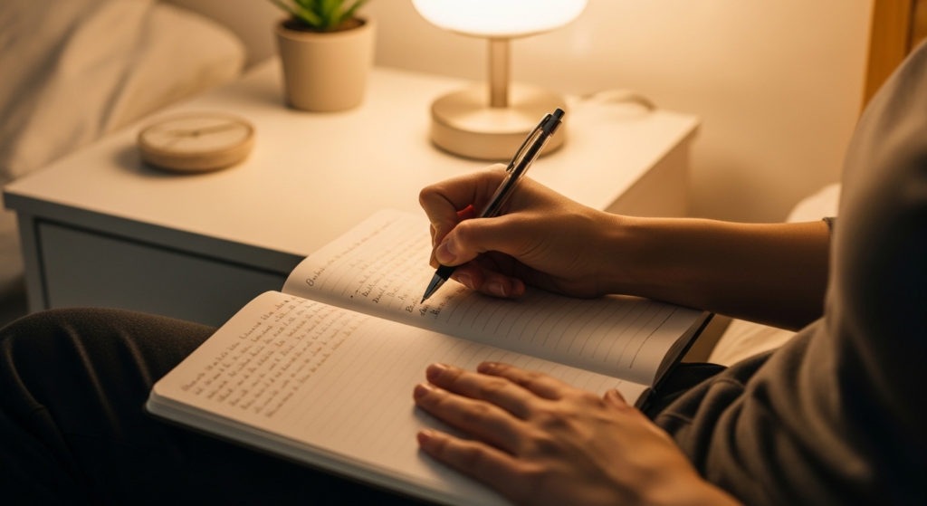 Three sentences: one win today, one thing out, one plan tomorrow. The two minutes of journaling make the day whole, silence the mind, and do not allow the anxieties of tomorrow to occupy the next night of quality sleep.