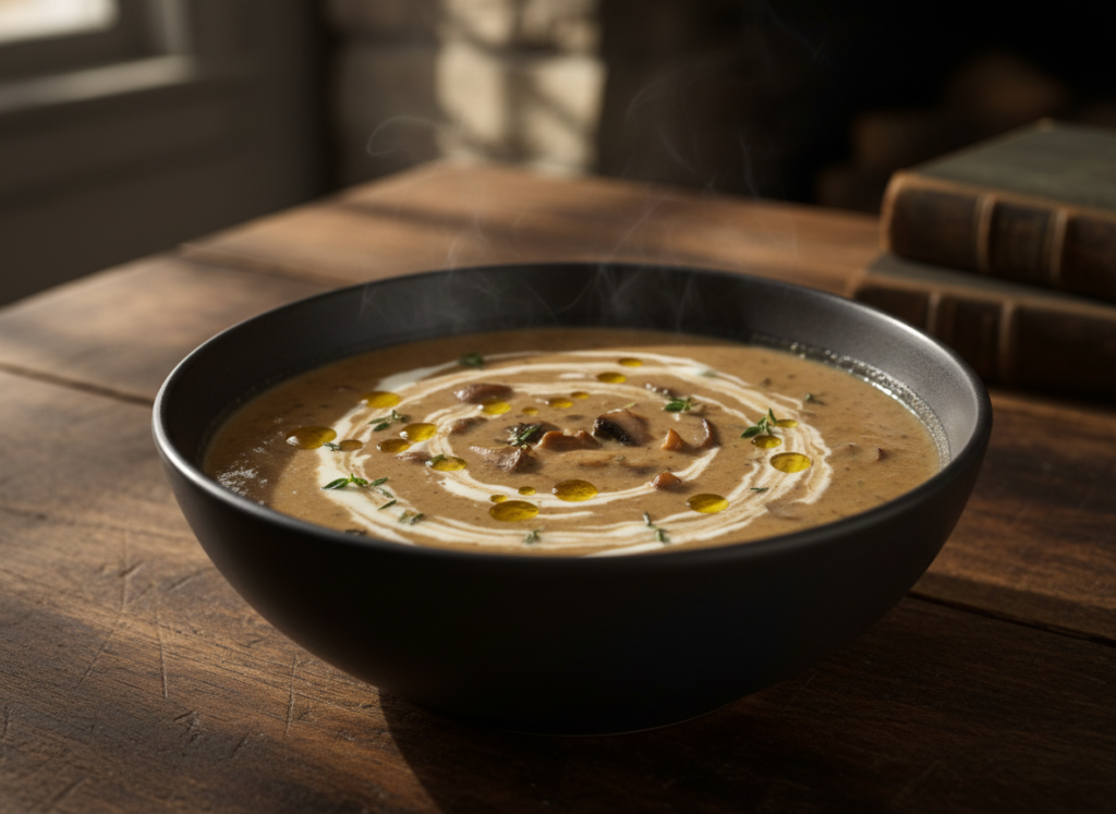 The truffles should go well with the musings of mushrooms. The soup is hot and opulent. Ideal for elegant starters.