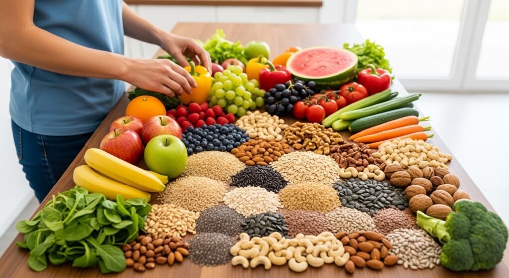 The base comprises fruits, vegetables, whole grains, legumes, nuts and seeds along with the olive oil. These are healthy foods that contain fibers, vitamins and healthy fats that help in the general health and sustenance of energy.
