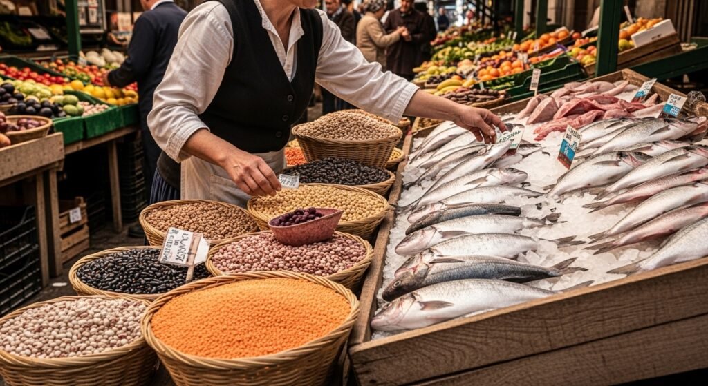 Proteins include fish, seafood, beans and lentils that are preferred. Red meat is sometimes eaten and moderate amounts of eggs, milk and chicken are taken.